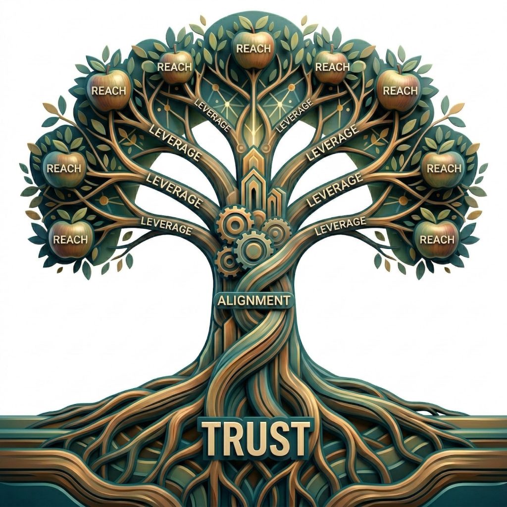 Trust is the root. Alignment is the trunk. Leverage is the branch. Reach is the fruit.